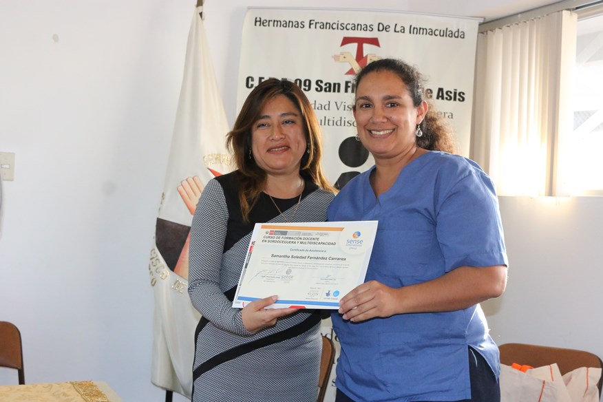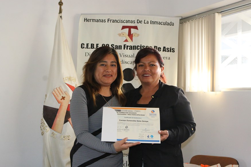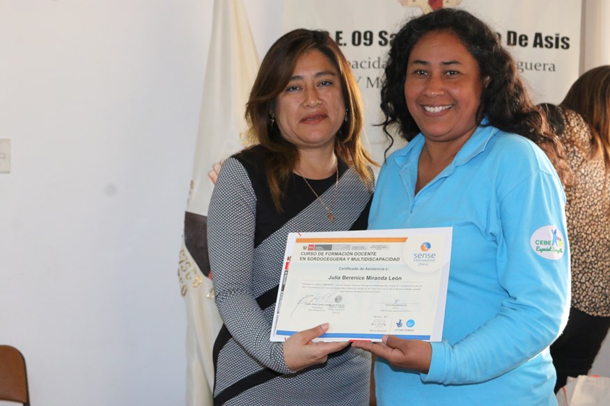 Maestras de Educación Básica Especial de la UGEL 07 recibieron certificación del Curso de Capacitación Docente en Sordoceguera y Multidiscapacidad, la cual se llevó a cabo dentro del convenio con la organización Sense Internacional (Perú). La clausura se realizó con la presencia de Ricardo Zevallos Arévalo, director general de Sense Internacional, y Gloria María Saldaña Usco, directora de la UGEL 07, en las instalaciones del CEBE San Francisco de Asís ubicado en el distrito de Surco.