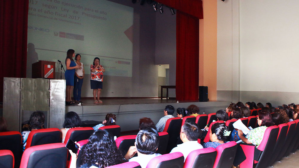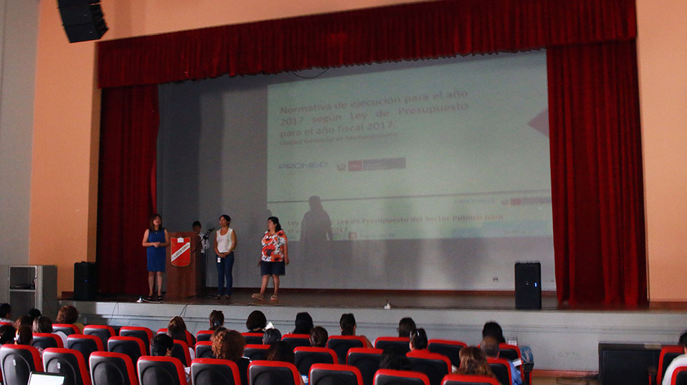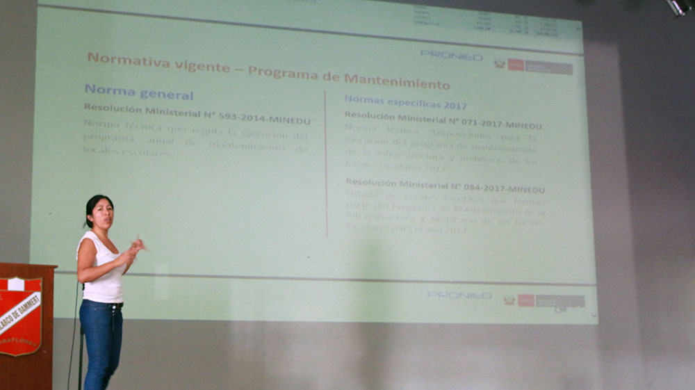 El pasado 22 de febrero a las 9:00 am se realizó la capacitación del Programa de Mantenimiento de Locales Escolares 2017. Esta capacitación tuvo como locación el auditorio de la I.E. Juana Alarco de Dammert, con la presencia de la Directora de la UGEL 07 Gloria María Saldaña Usco, la Arquitecta Cecilia Bailly Pineda y como ponente principal a la Ingeniera Wendy Huamán Ticona sectorista del PRONIED.