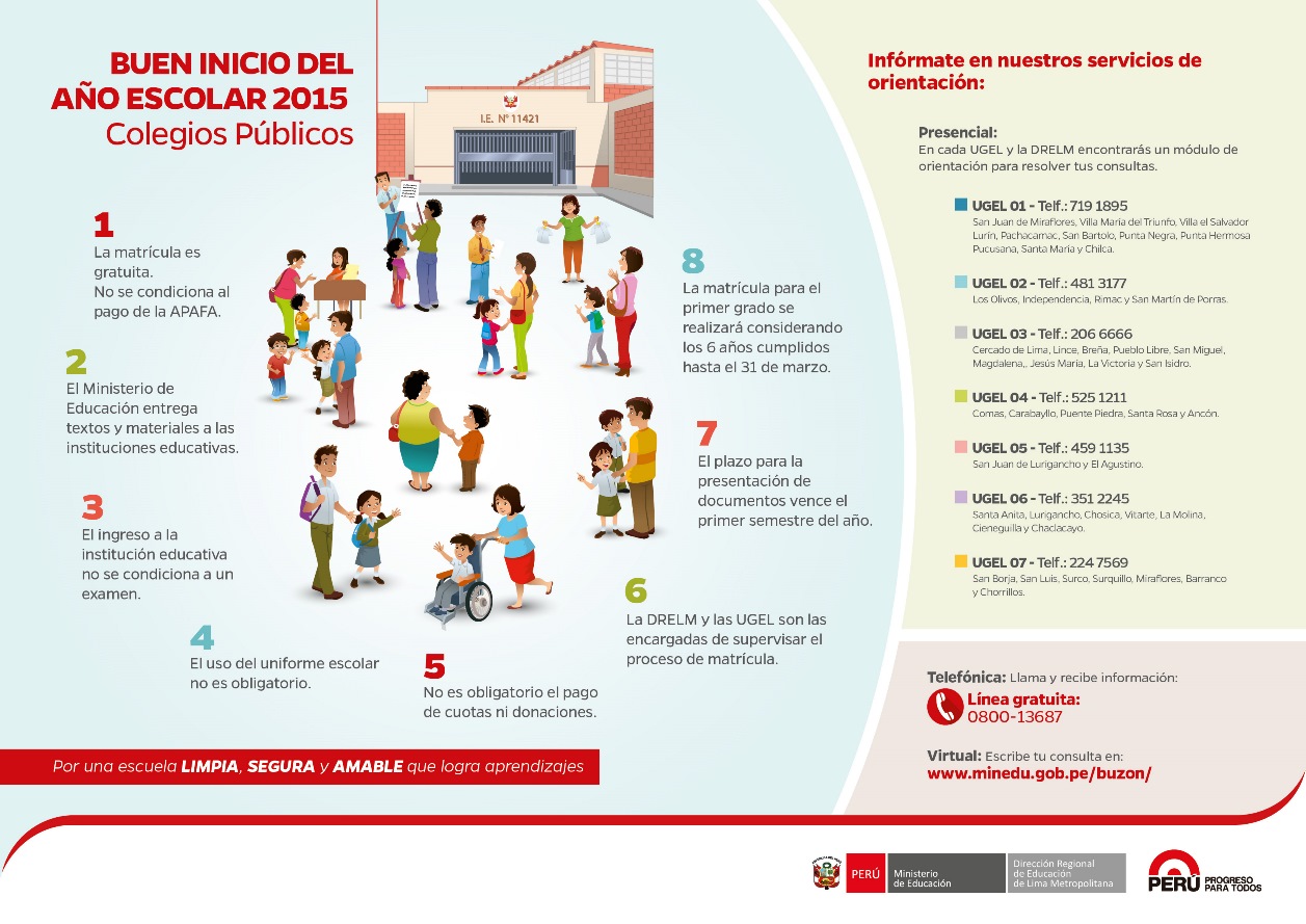 El Ministerio de Educación, en coordinación con la DRELM y las 7 UGEL de Lima Metropolitana, brinda orientación a padres de familia de forma virtual, presencial y telefónica con el objetivo de resolver consultas sobre el proceso de matrícula 2015 y otros temas que puedan vulnerar el derecho a la educación en instituciones educativas públicas como privadas.