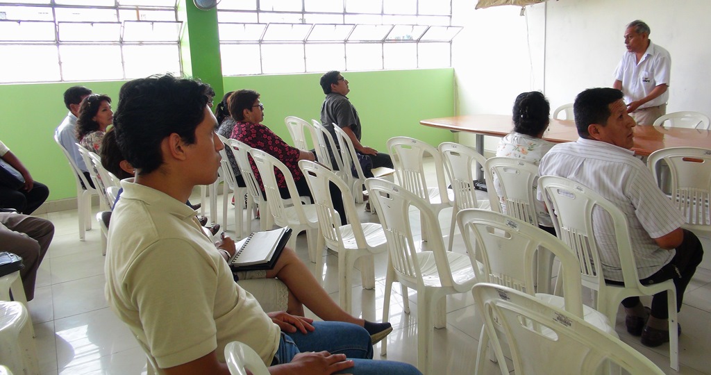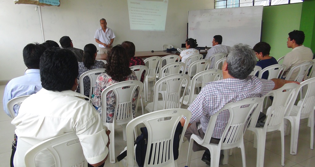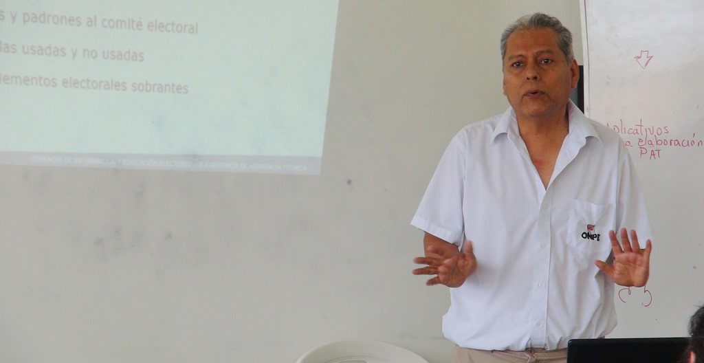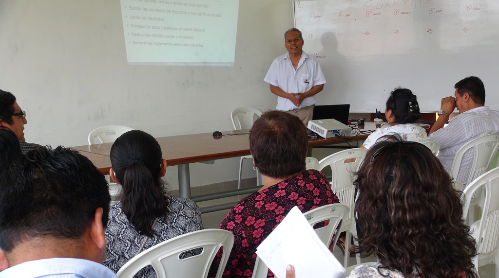 Tras las gestiones realizadas por el área de Recursos Humanos de la UGEL 07, el representante de la ONPE, Guido Arce, explicó y capacitó a los miembros de mesa y personeros temas basados sobre el procedimiento de esta elección.