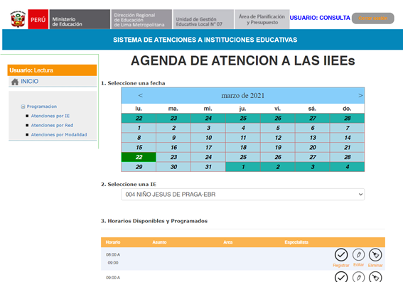 • Estimados directores y docentes de nuestra comunidad, el Equipo de Tecnologías de la Información (ETI) de la UGEL 07 pone a su disposición un nuevo sistema para mejorar el proceso de visita de nuestros especialistas a las instituciones educativas.