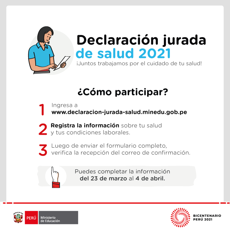 La declaración jurada podrá ser llenada por los servidores hasta el 4 de abril. Para acceder al formulario virtual, hay que ingresar al enlace https://declaracion-jurada-salud.minedu.gob.pe, colocar la información requerida, enviar el formulario virtual completado y verificar la recepción del correo de confirmación.