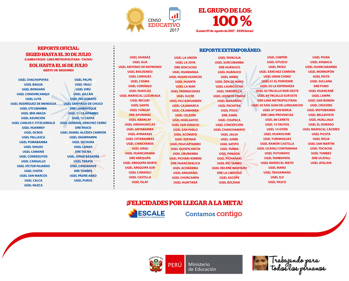 La Unidad de Gestión Educativa Local N° 07 cumplió con los objetivos con la cobertura de matrícula, esto se conoció tras el anuncio de la Unidad de Estadística del Ministerio de Educación hizo oficial y pública la información del cumplimiento de la remisión de datos del módulo Primero del Censo Escolar.