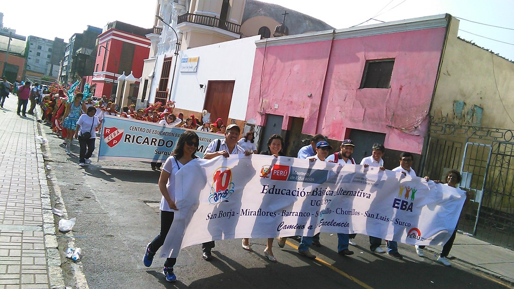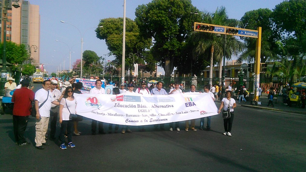 El director de la UGEL N° 07, junto a otras autoridades de la institución, participó en el colorido pasacalles que se realizó en el Cercado de Lima, acompañando a los jóvenes y adultos, estudiantes de los diversos EBA de San Borja, Surco, San Luis, Surco, Surquillo, Barranco y Miraflores.