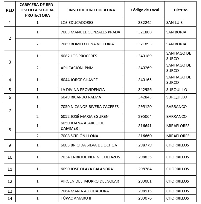 Mediante Resolución Directoral N° 008605-2015, la Unidad de Gestión Educativa Local N° 07 (UGEL 07) aprobó y designó a 18 Instituciones Educativas como Escuelas Seguras Protectoras en cada una de las Redes Educativas de la UGEL 07.