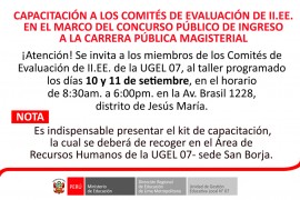 Leer másSe recuerda a los miembros de los comités de evaluación de las II.EE. de la UGEL 07 al taller programado para los días jueves 10 y viernes 11 de setiembre, en el horario de 08:30 a 18:00 hrs en la Av. Brasil 1228, distrito de Jesús María.