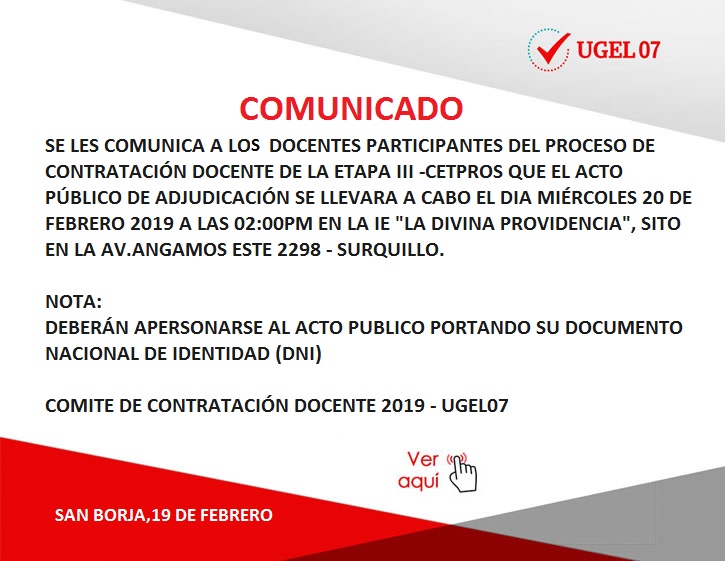 COMUNICADO: Se comunica a los docentes participantes del Proceso de Contratación Docente de la ETAPA III – SEGUNDO TRAMO que el Acto Público de adjudicación se llevará a cabo el día Lunes 25 de Febrero 2019 a las 02:00pm en la IE “La Divina Providencia”, sito en Av. Angamos Este Nº 2296 – Surquillo.