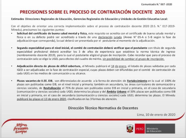 El Comité de Contratación Docente 2020 de la Unidad de Gestión Educativa Local N°07, en el marco del D.S. 017-2019 MINEDU, el Oficio Múltiple N°031-2020-MINEDU/VMGP-DIGEDD-DITEN y en el contexto de la emergencia sanitaria por el COVID-19, convoca a los docentes que se encuentran en el cuadro de mérito de la especialidad de Educación para el Trabajo (Informática), nivel SECUNDARIA, modalidad EBR, FASE III, al proceso de adjudicación de plazas.