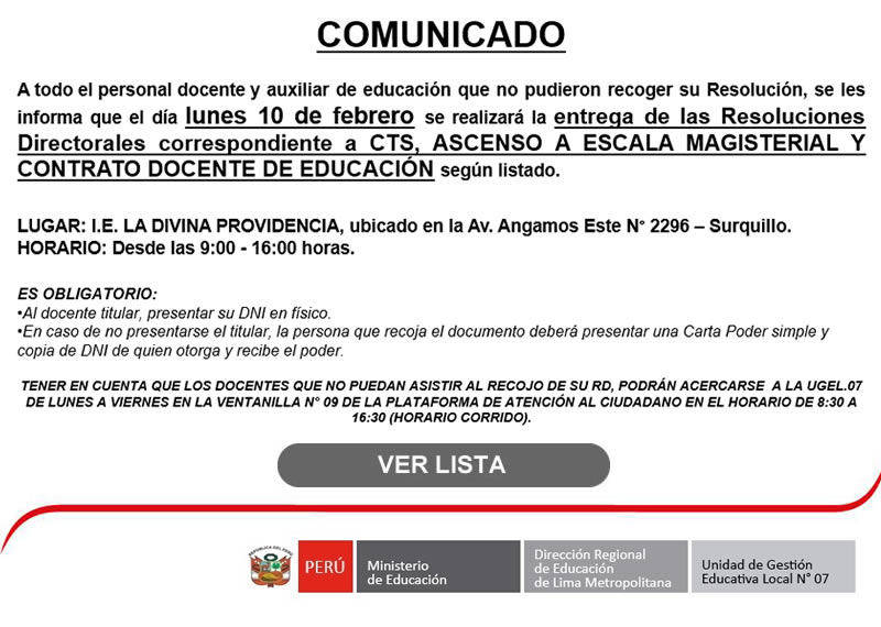 Se comunica al Personal Docente que la entrega de Resoluciones de Contrato Etapa I, se realizará en dos tramos, el primer grupo se entregará el día VIERNES 25 de enero del 2019 a las 14:00 horas en las instalaciones de la IE. DIVINA PROVIDENCIA (Av. Angamos Este Nº 2296 – Surquillo), de acuerdo a la relación adjunta. (portar obligatoriamente su DNI).