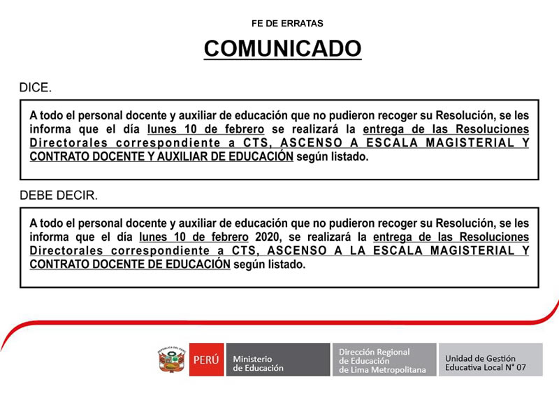 El Comité de Contratación Docente 2020 de la Unidad de Gestión Educativa Local N°07, en el marco del D.S. 017-2019 MINEDU, el Oficio Múltiple N°031-2020-MINEDU/VMGP-DIGEDD-DITEN y en el contexto de la emergencia sanitaria por el COVID-19, convoca a los docentes al proceso de adjudicación de las plazas vacantes para la modalidad EBR nivel SECUNDARIA – FASE III, especialidad de Inglés que se encuentran en el cuadro de mérito, cuyo acto público no presencial se llevará a cabo el día VIERNES 02 de Octubre a las 4.30 p.m. a través de la Plataforma Virtual (el link será remitido oportunamente a los correos electrónicos de los postulantes).
