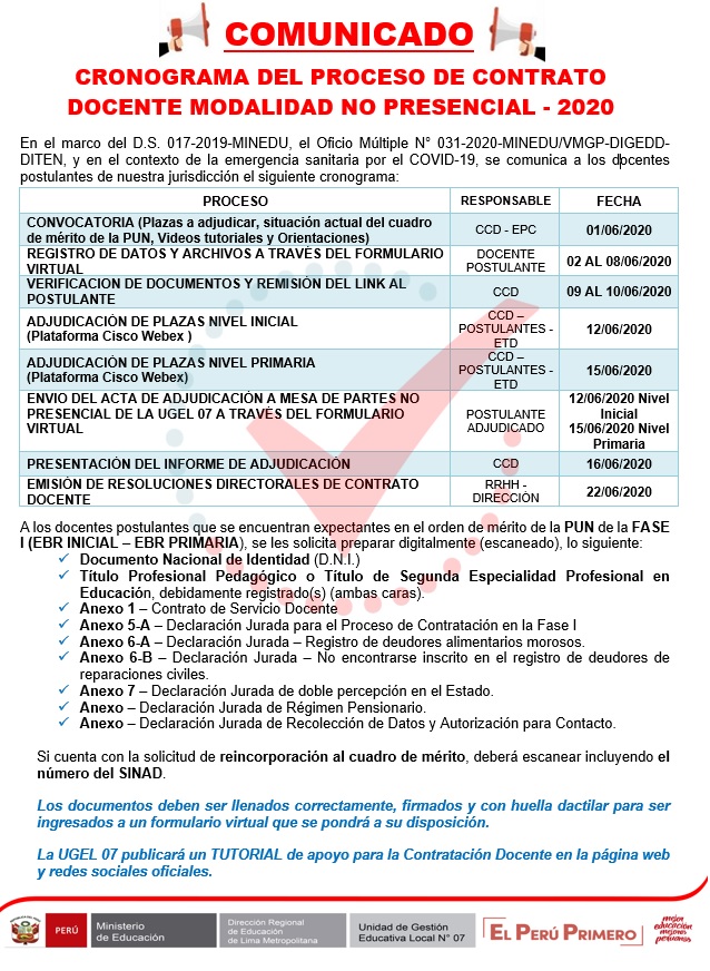 El Comité de Contratación Docente 2020 de la UGEL N°07, en mérito al D.S. N° 017-2019-MINEDU, y el Oficio Múltiple N°031-2020-MINEDU/VMGP-DIGEDD-DITEN; debido a la emergencia sanitaria por el COVID-19, convoca a los docentes al proceso de contratación de plazas vacantes NO PRESENCIAL para la modalidad EBR – INICIAL de la FASE I. El ACTO PÚBLICO NO PRESENCIAL, se llevará a cabo el día MIÉRCOLES 30 de Setiembre de 2020 a las 3.00 p.m. a través de la Plataforma Virtual Cisco Webex (el link será remitido oportunamente a los correos electrónicos de los postulantes admitidos del Cuadro de Méritos).
